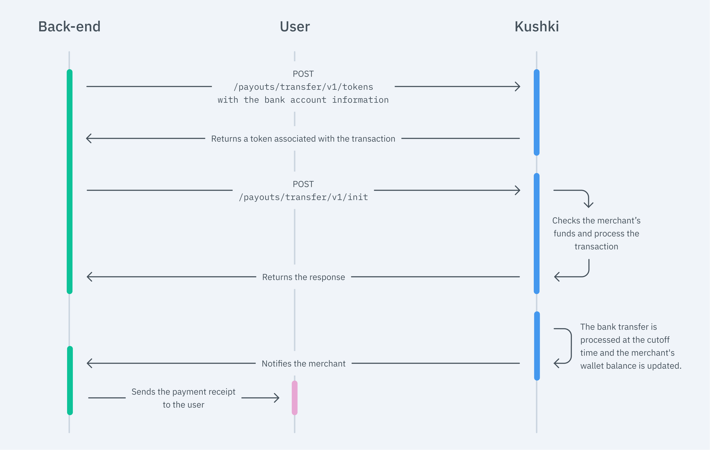 The disbursement process in Colombia is carried out following the flow that appears below: Merchant > Kushki > Bank > User.